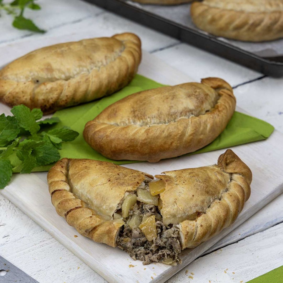 Hand-crimped Cornish shortcrust pastry, packed with rich minced lamb, potato, swede, onion and a refreshing touch of mint.